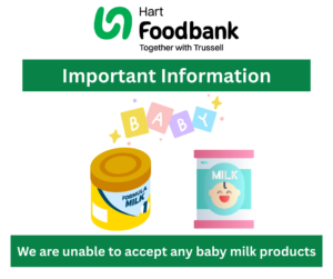 Foodbanks in the Trussell network are unable to accept donations of infant formula or baby milk. This follows advice issued by UNICEF, which highlights the potential health risks associated with distributing formula.
