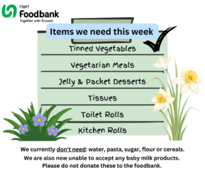 Please find the Hart Foodbank needs list for this week below:
